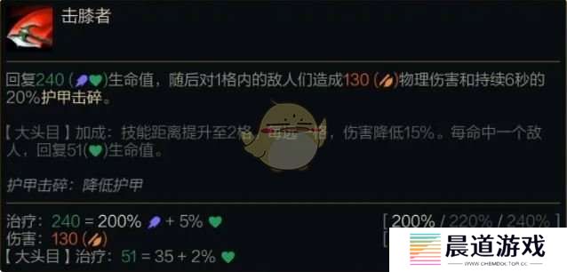 回复(200%/220%/240%法术强度+5%最大生命值)生命值,随后对1格内的敌人们造成(200%攻击力)物理伤害和持续6秒的20%护甲击碎。