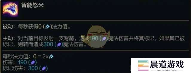主动:对当前目标发射一支弩箭,造成(190%/285%/455%法术强度)魔法伤害并将其标记。如果其已被标记,则转而造成(300%/450%/720%法术强度)魔法伤害。