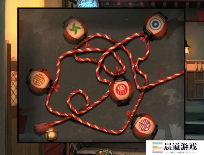 剧情后上楼梯,在罐子右边的楼梯上拿到小石头,后面的柜子上拿到放大镜,旁边这个绳结肯定是要用到的,可以记一下从铃铛开始是眼睛-寿-福-达摩-风车,回到药店门口和弟弟对话得知弟弟在教妖怪折纸,继续回到左边店铺,查看左边的乌鸦店铺,在乌鸦左侧有个小箱子,使用放大镜查看一下发现写着*箱,而*箱的下面就是很小的按键了。