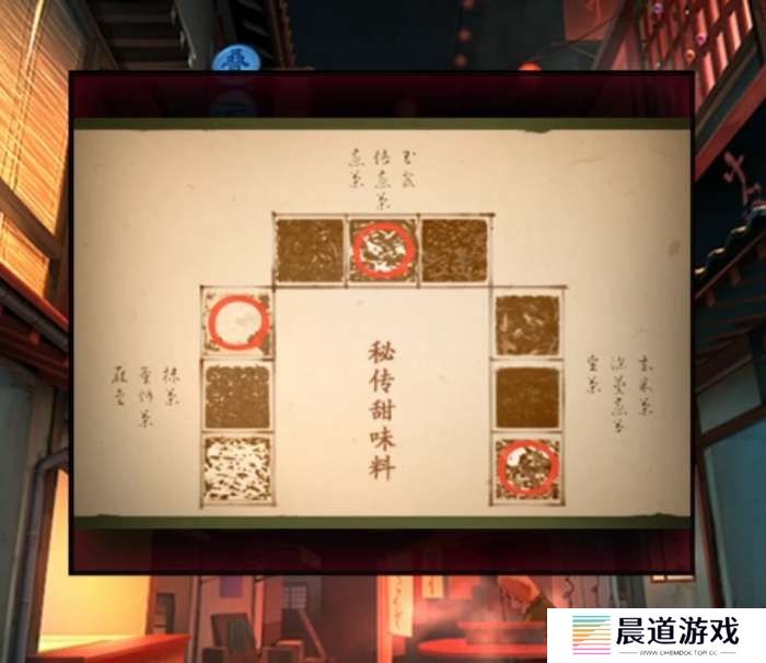 一路后退到已经空荡荡的大街上,查看左边的茶摊,戳破青蛙老板的泡泡后给他睡不着眼药水,老板表示可以送一包茶,这时候就可以选茶了,但是我们还没有足够的提示先等下。查看后面已经没有小青蛙的箱子,下面有提示左=2,右=2,你以为这个是数字?其实是误导的,我们直接无视这个提示,根据茶=*人木的提示,那么秘茶方略就能分解为秘=禾+必,茶=*人木,方=方,略=田+各,也就是秘2部分,茶3部分,方1部分,略2部分,所以我们调整数字为2313后打开柜子拿到秘制甜味料。