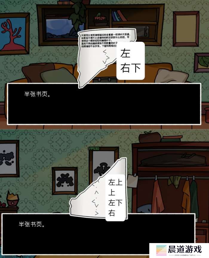用复活钥匙打开书架下的柜子,叶子的点击顺序是卧室床边和沙发抱枕下的半张书页上的线索
