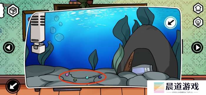 点击鱼缸使用氧气泵和过滤网,拿到一个刀片,根据鱼缸底的颜色(粉绿青蓝)打开锁得到蓝色U盘