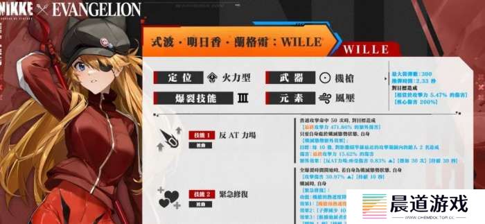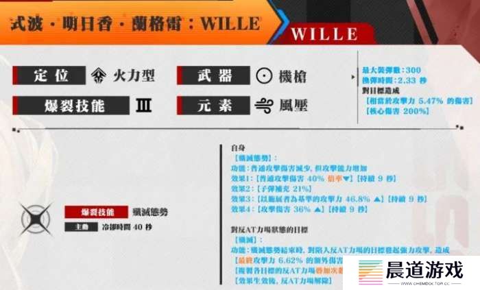 因为是联名的角色,在游戏中是限时招募,在稀有度上是非常需要的,整体角色的阶段为三阶角色,属性是燃烧。在游戏中使用的武器是步枪,平a的普攻效果是能够对敌人造成19%的攻击力伤害核心伤害比较低,只有200%,但是换弹时间是比较短的,只需要一秒。