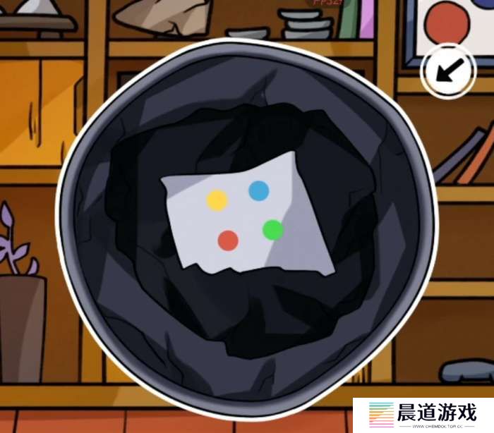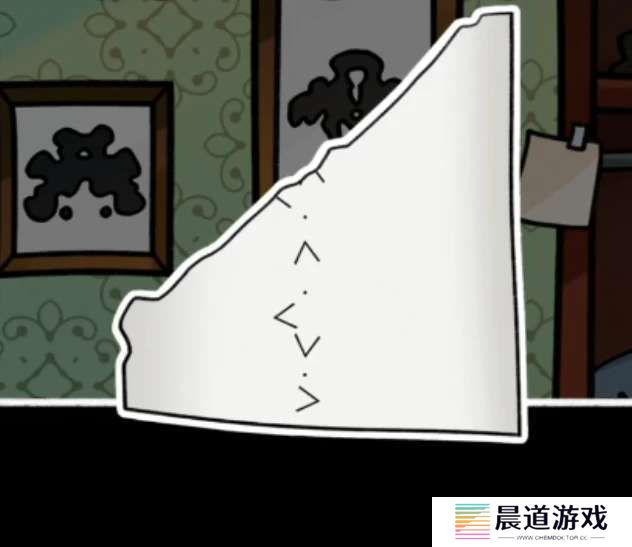 继续左转到书架场景,左边有一棵有点眼熟花,查看一下书架上的书有一页被撕掉了,那么我们前面捡到的两个半张纸拼起来就是花的点击顺序了,依次是左、右下、上左、上、左下、右,点击完毕后看到一张带颜色的纸条。