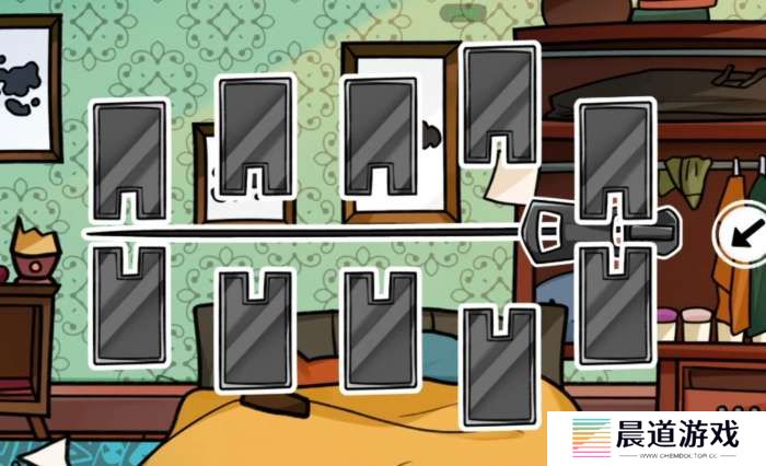 出门对*袋使用剪刀,剪开后翻找一下拿到床头柜钥匙,对最左边的包裹使用打火机获得向下的方形按键,然后我们就可以前往卧室了,在沙发场景有个左下角的箭头,点一下到卧室场景。墙上中间的那幅画三个角有小点点,要把物品栏收起来才能看清楚,依次点击三个小点点掉下半块木板,因为只有一半所以我们后面再拼。