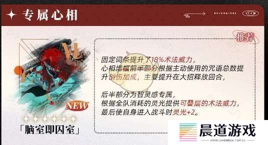 固定词条提升了18%术法威力,心相增幅前半部分根据主动使用的咒语总数提升创伤加成,主要提升在大招释放回合,后半部分为智灵感专属,根据全队消耗的灵光提供可叠层的术法威力,最后使自身进入战斗时灵光+2。