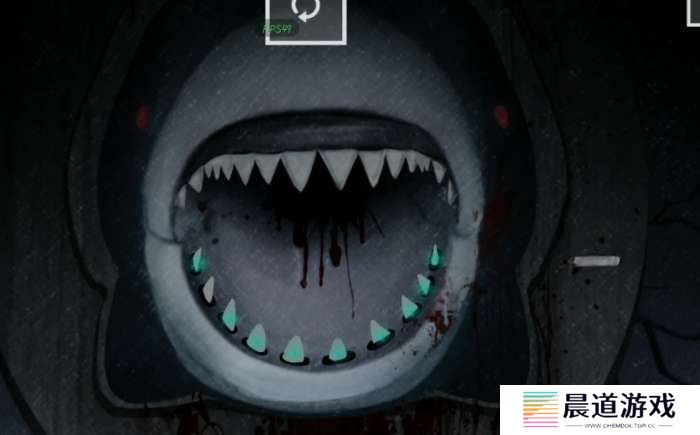继续向右走来到最右边房间,把女人偶和化妆镜放在机器上,然后点击化妆镜就能开始引路,这个很简单就是把左边的小人引到右边,注意小人别掉进洞里就行,引到后拿到一瓶荧光粉,还画了个鲨鱼,那就回到最左边去把荧光粉洒在鲨鱼上面吧,撒上后果然有一个牙齿很特别,所以把有荧光的都点一遍就行了,只剩最后一颗时候拿到尖锐的牙齿。