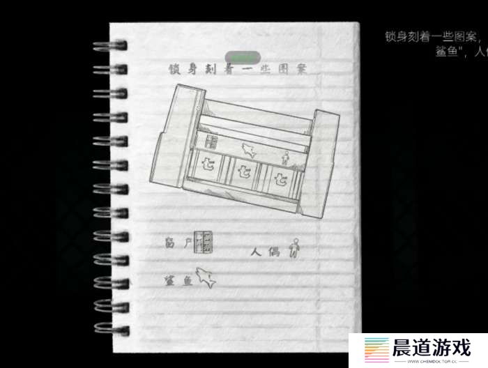 进入后门旁边就有个干尸,查看一下拿到女纸人,继续向左走有个折叠梯需要密码,密码提示如果看不清楚图案可以看右上角的笔记本,笔记上清楚的提示窗户、鲨鱼、人偶,我们已经知道窗户是十,人偶应该就是雕像上的六了,鲨鱼在最左边过去看看。
